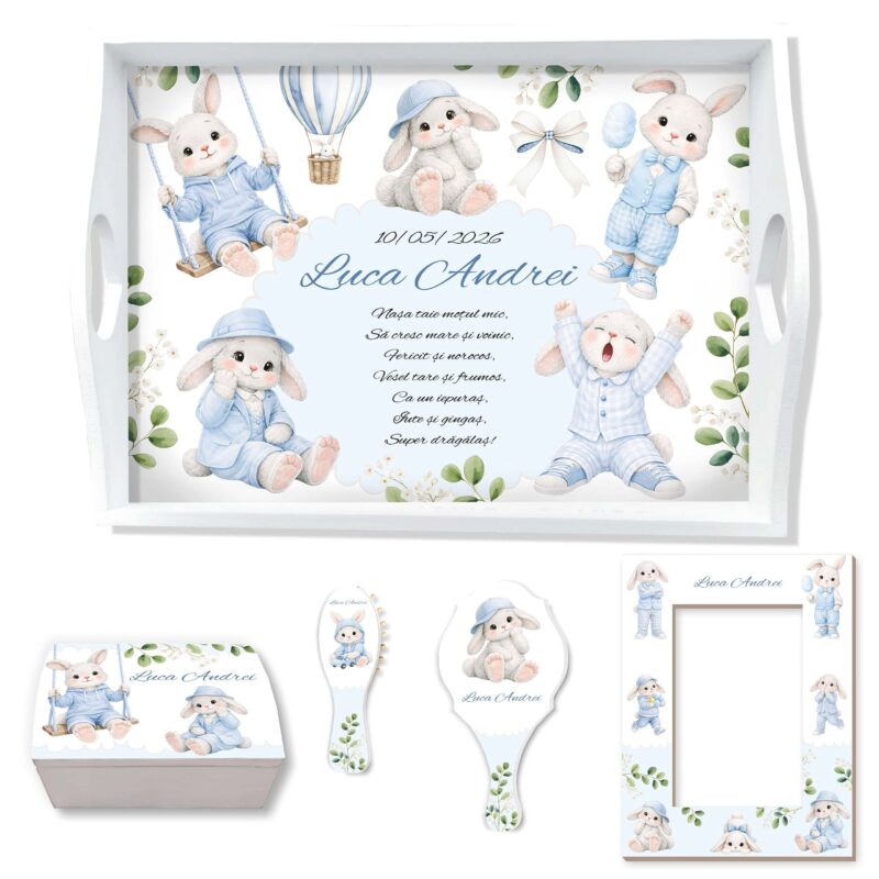 Set Bunny Baby Blue cu tăviță moț personalizată ce transmite blândețe și eleganță, cu iepurași adorabili în nuanțe bleu, pentru un băiețel vesel și iubit.💙🐰