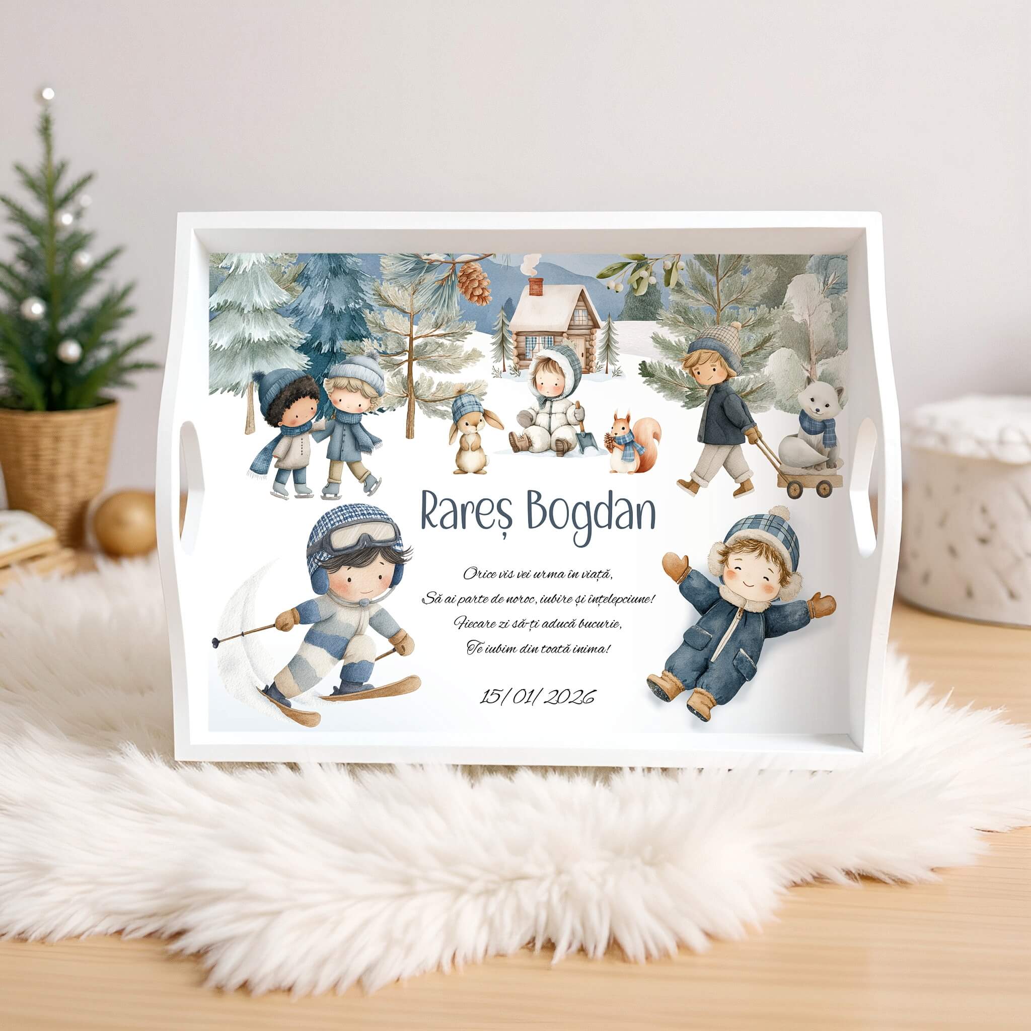 La Joacă în Zăpadă • Set Tăiere Moț Băiețel personalizat, poate conține: tăviță, cutiuță, perie, oglindă și ramă foto. Puteți configura setul și doar cu o parte dintre obiecte (ex: tava + cutie + perie).