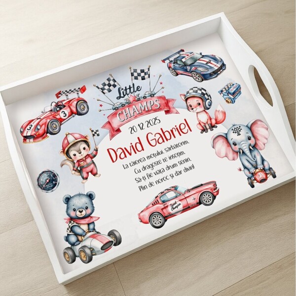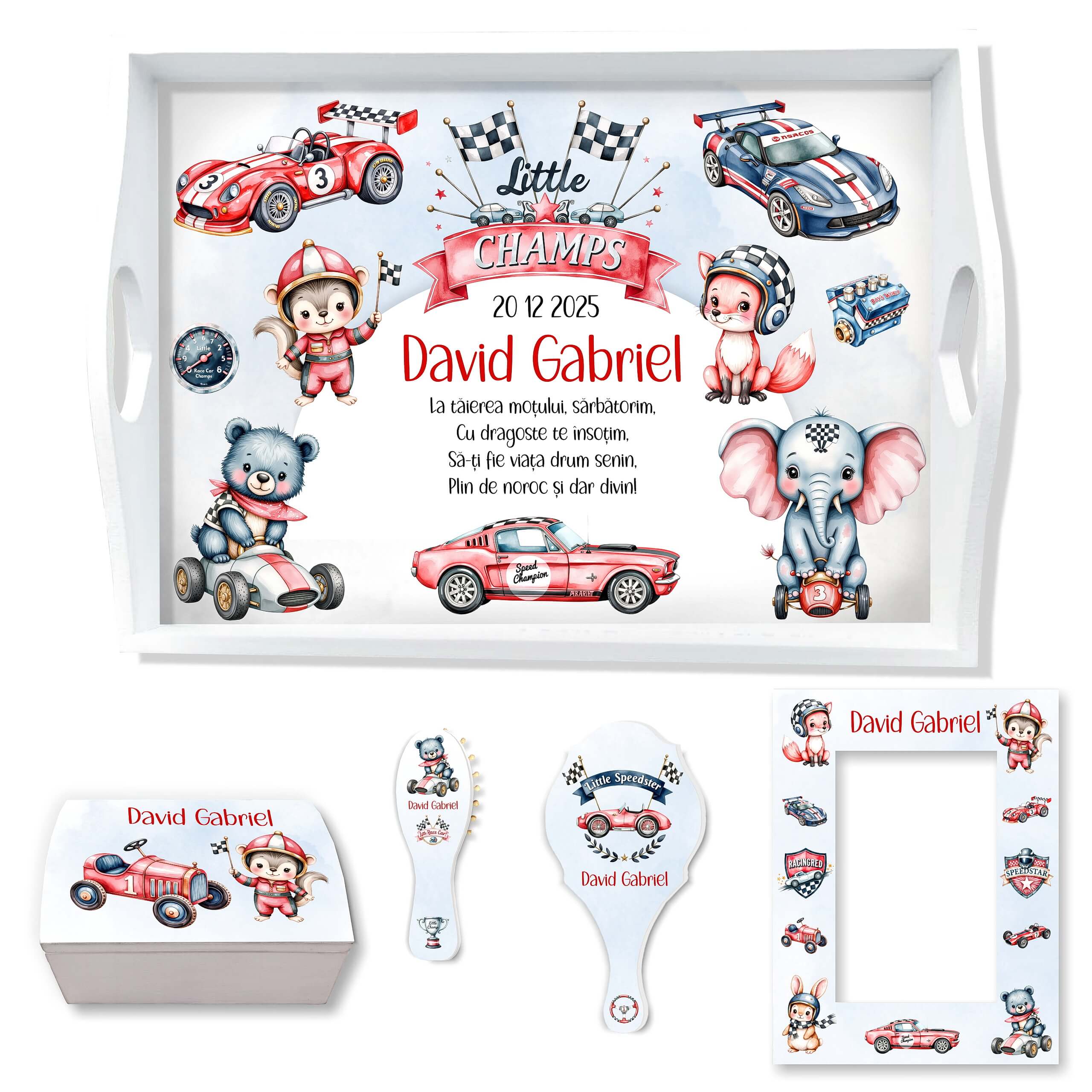 Little Champs • Set Taviță Moț Băiețel cu Mașinuțe, personalizat, pentru tăierea moțului, poate conține: tăviță, cutiuță, perie, oglindă și ramă foto. Puteți configura setul și doar cu o parte dintre obiecte (ex: tava + cutie + perie).