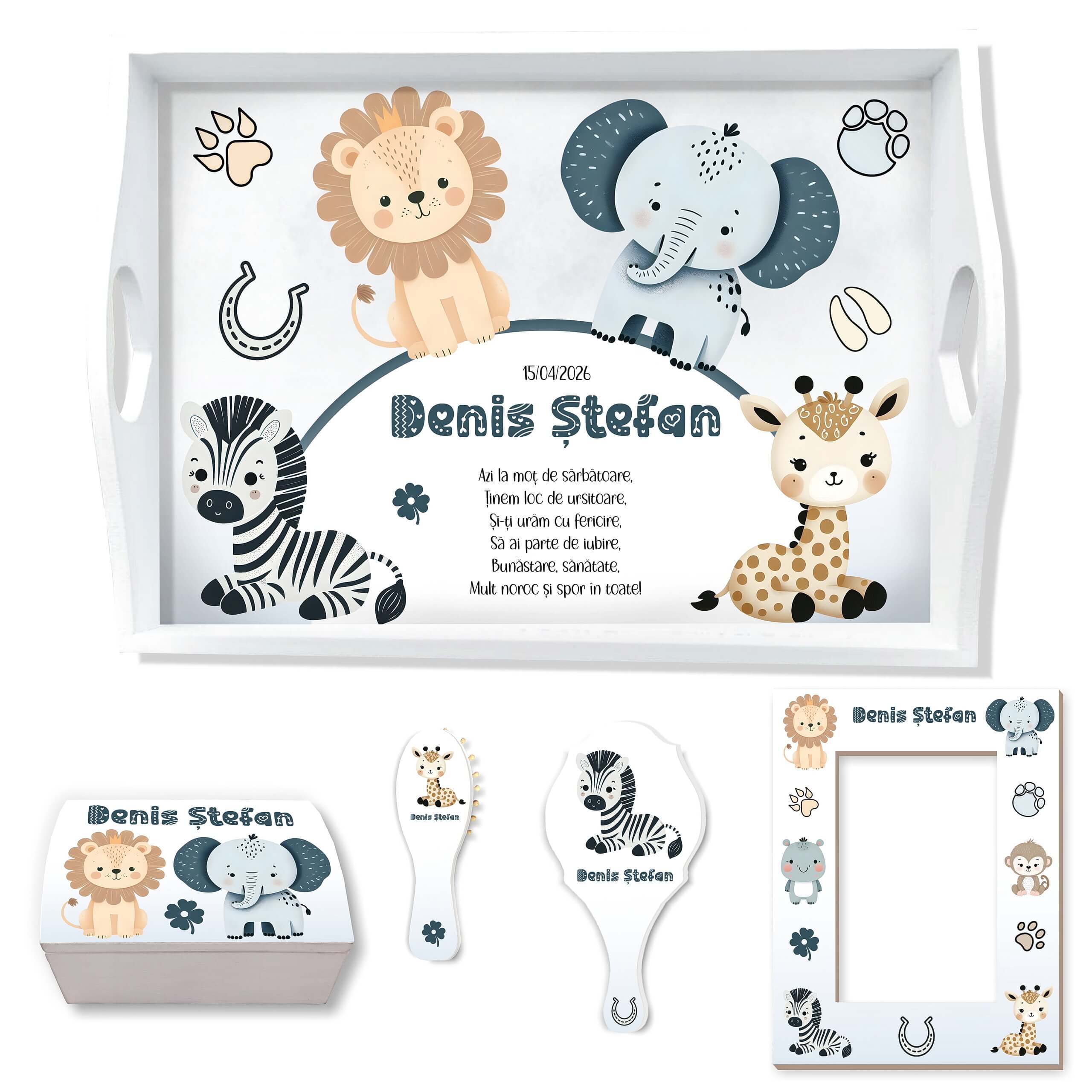 Lucky Safari Baby Blue • Set Tavita Mot Baieti personalizat, pentru tăierea moțului, conține: tăviță, cutiuță, perie, oglindă și ramă foto. Puteți configura setul și doar cu o parte dintre obiecte (ex: tava + cutie + perie).