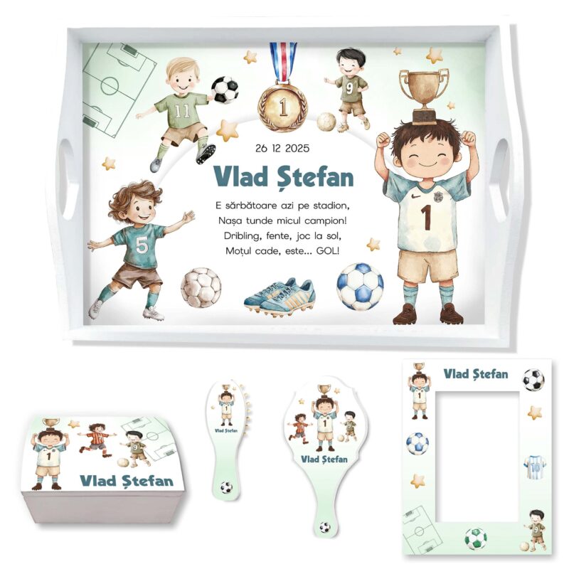 Micul Fotbalist • Set Moț Băiețel tematică Fotbal, set personalizat pentru tăierea moțului poate conține: tăviță, cutiuță, perie, oglindă și ramă foto. Puteți configura setul și doar cu o parte dintre obiecte (ex: tava + cutie + perie).