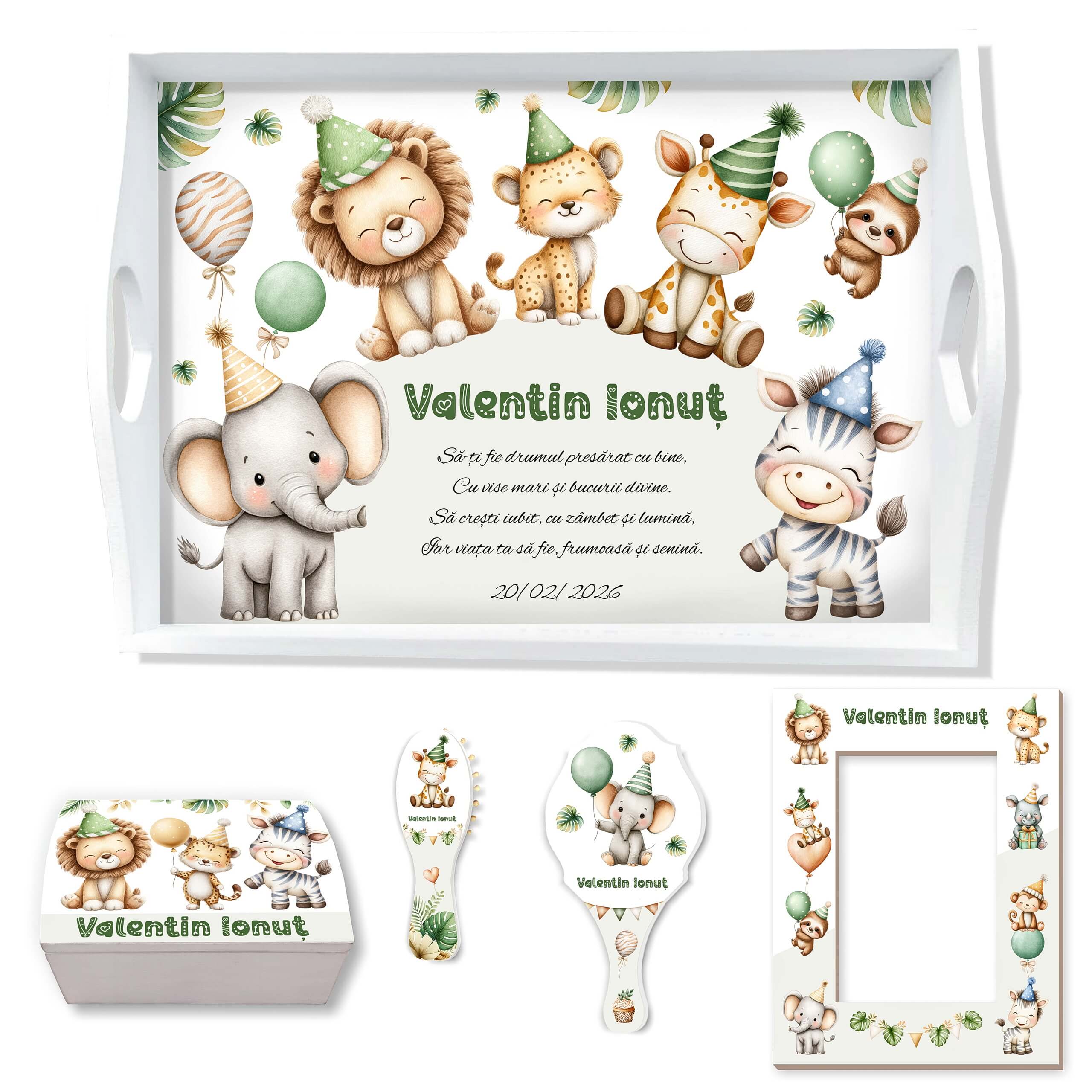 Safari First Birthday • Set Tavita Mot Baiat, personalizat, pentru tăierea moțului, poate conține: tăviță, cutiuță, perie, oglindă și ramă foto. Puteți configura setul și doar cu o parte dintre obiecte (ex: tava + cutie + perie).