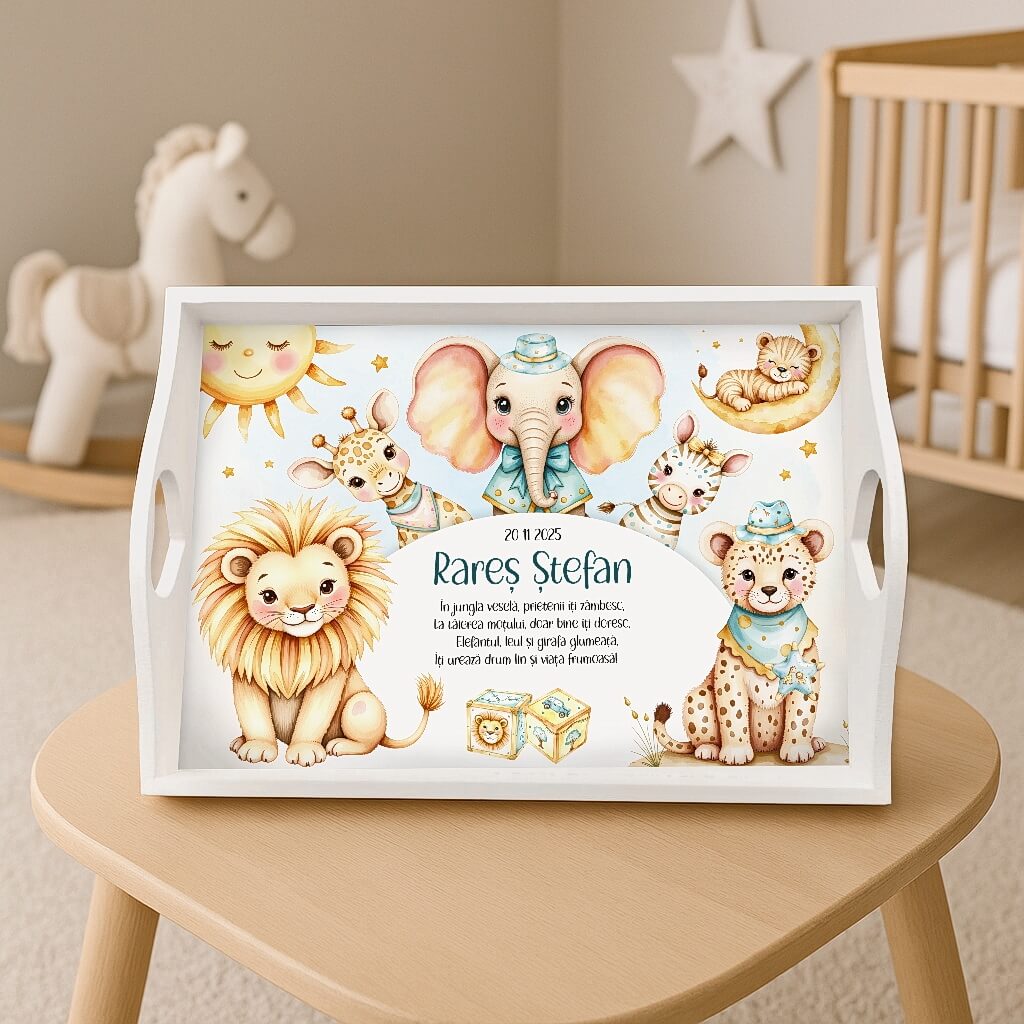 Safari Friends • Set Taviță Moț Băiețel, personalizat, pentru tăierea moțului, poate conține: tăviță, cutiuță, perie, oglindă și ramă foto. Puteți configura setul și doar cu o parte dintre obiecte (ex: tava + cutie + perie).