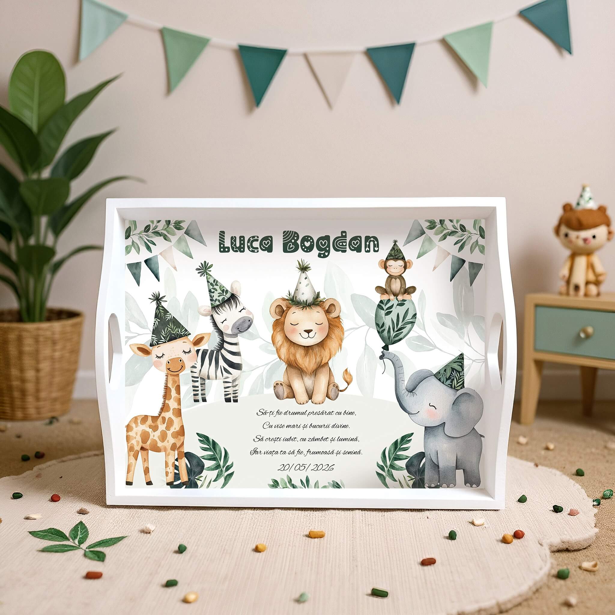 Decorat cu animăluțe vesele din junglă purtând pălărioare de petrecere, frunze tropicale și ghirlande festive, acest set aduce bucurie, culoare și energie pozitivă în ziua specială a micuțului tău.