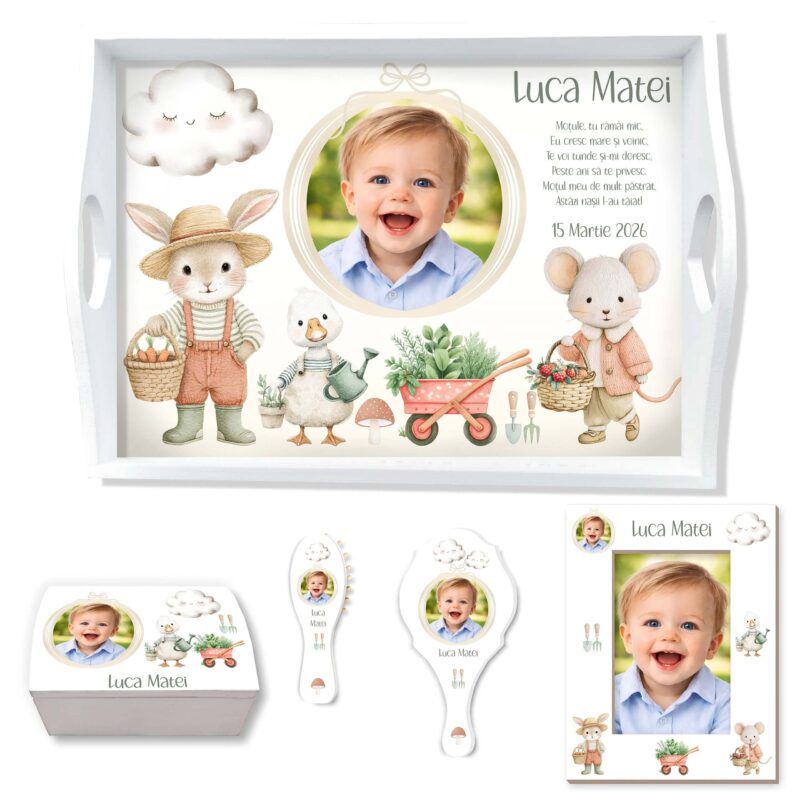 Set Moț Personalizat cu Poză Băiat • Micul Grădinar personalizat, pentru tăierea moțului, conține: tăviță, cutiuță, perie, oglindă și ramă foto. Puteți configura setul și doar cu o parte dintre obiecte (ex: tava + cutie + perie).