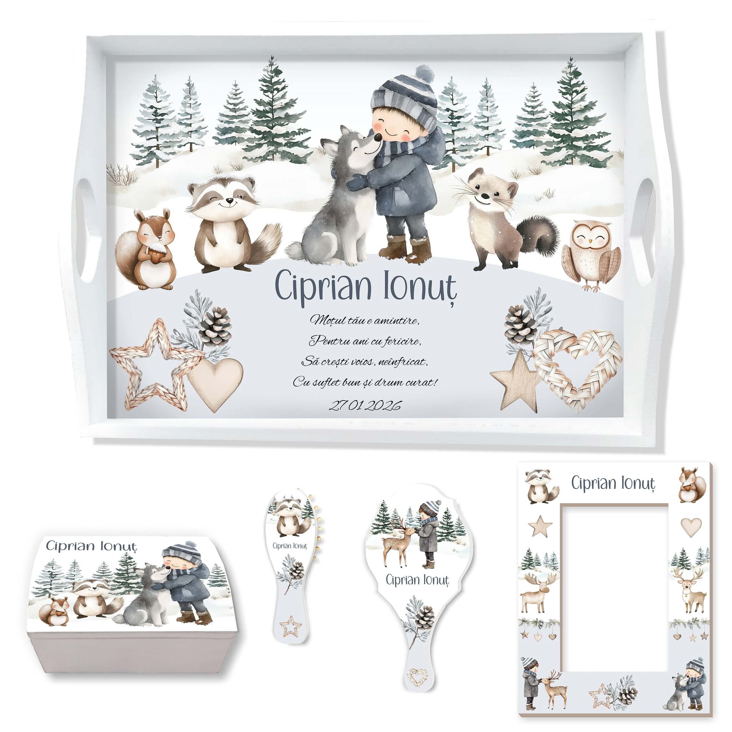 Tăviță Moț Băiețel cu Animăluțe Iarna • Set Personalizat personalizat, pentru tăierea moțului, conține: tăviță, cutiuță, perie, oglindă și ramă foto. Puteți configura setul și doar cu o parte dintre obiecte (ex: tava + cutie + perie).