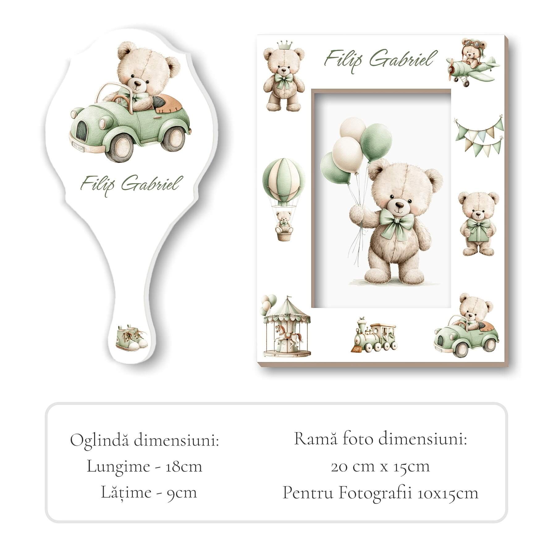 Setul Green Teddy Bear pentru taierea motului pentru baieti, cu ursuleti adorabili si elemente decorative precum masinuta, avion, baloane si carusel, toate in nuante elegante de verde sage. 💚🧸🎈