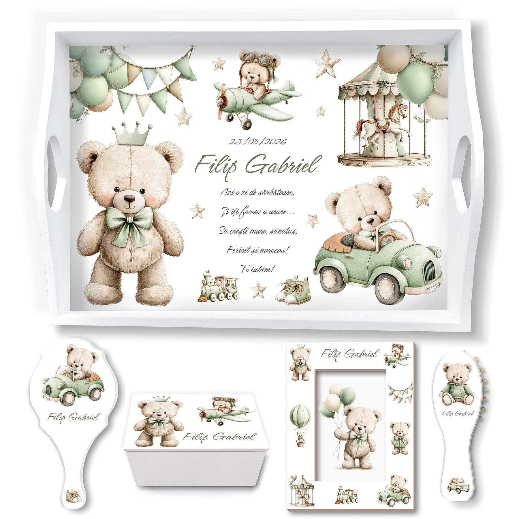 Set pentru taierea motului Green Teddy Bear pentru baieti, tavita mot cu ursulet teddy si elemente jucause in nuante verde sage. Perfect pentru taierea motului, prima aniversare si sedinte foto memorabile. 💚🧸✨