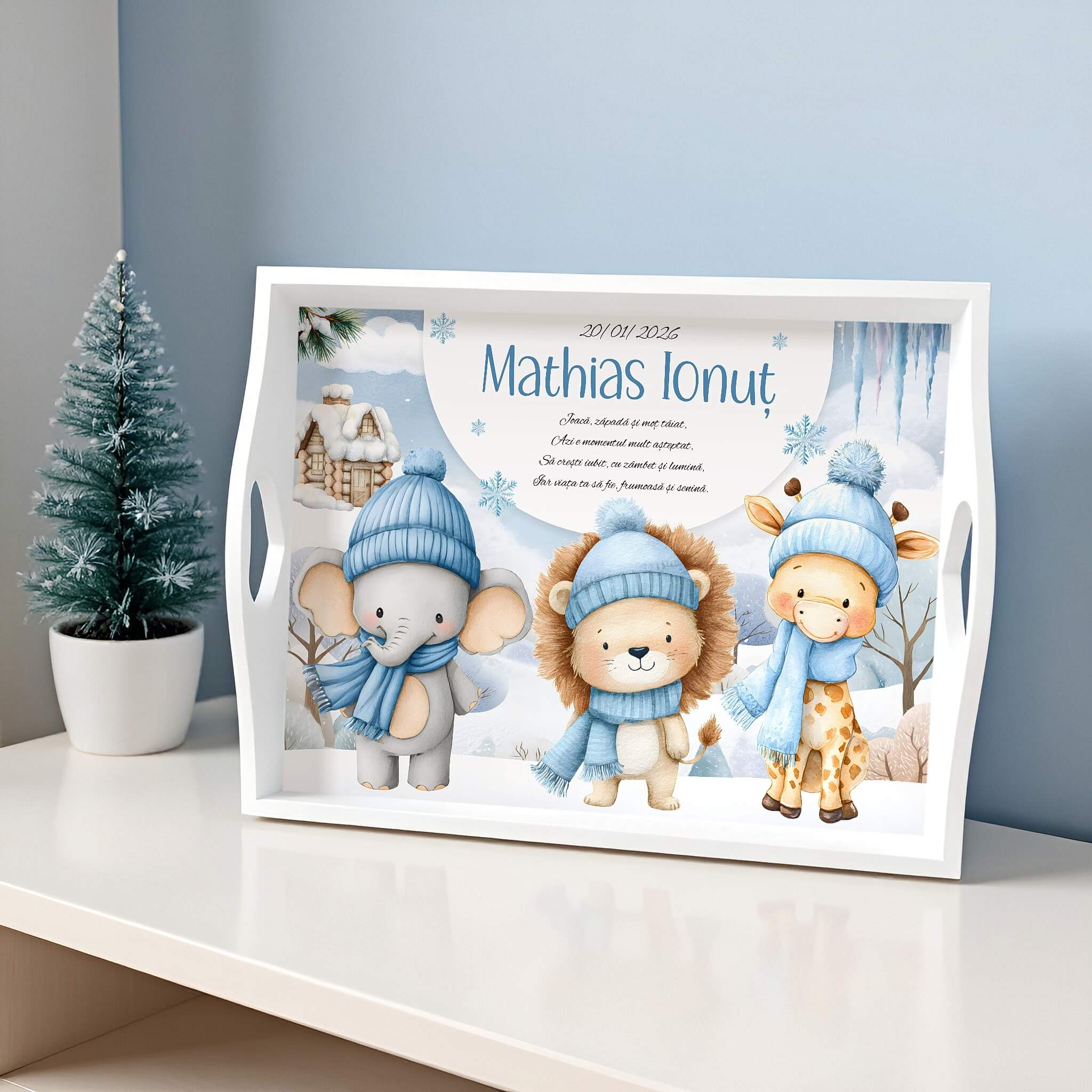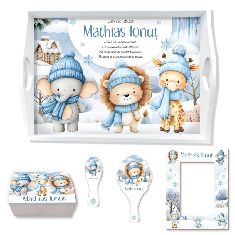 Winter Safari • Set pentru tăierea moțului personalizat, poate conține: tăviță, cutiuță, perie, oglindă și ramă foto. Puteți configura setul și doar cu o parte dintre obiecte (ex: tava + cutie + perie).
