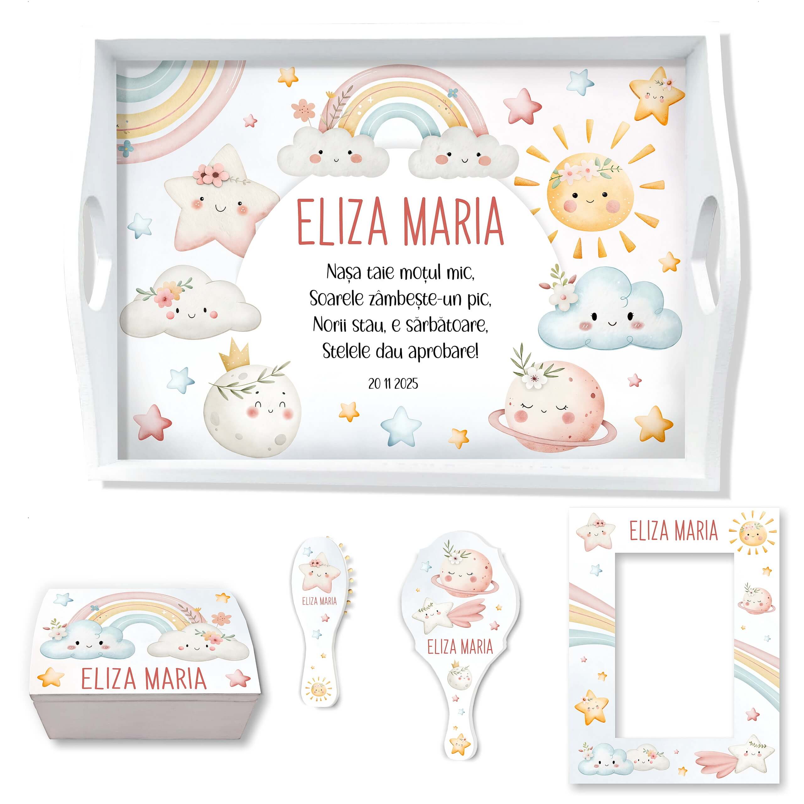 Setul pentru tăierea Moțului la Fetițe, Cerul Vesel, inspirat de cerul senin și personajele vesele din norișori zâmbitori, steluțe, curcubeu, planete și soare luminos, este alegerea perfectă pentru o sărbătoare plină de culoare și emoție. 🌈🌟☁️🌞