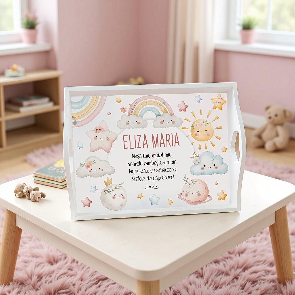 Cerul Vesel • Set pentru tăierea moțului personalizat poate conține: tăviță, cutiuță, perie, oglindă și ramă foto. Puteți configura setul și doar cu o parte dintre obiecte (ex: tava + cutie + perie).