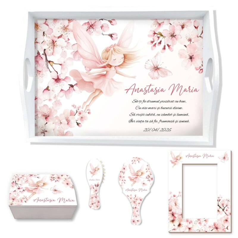 Fairy Cherry Blossoms • Set Tăviță Moț Fetiță cu Zână și Flori de Cireș personalizat, pentru tăierea moțului, conține: tăviță, cutiuță, perie, oglindă și ramă foto. Puteți configura setul și doar cu o parte dintre obiecte (ex: tava + cutie + perie).