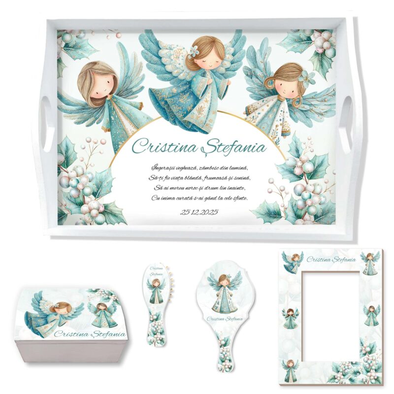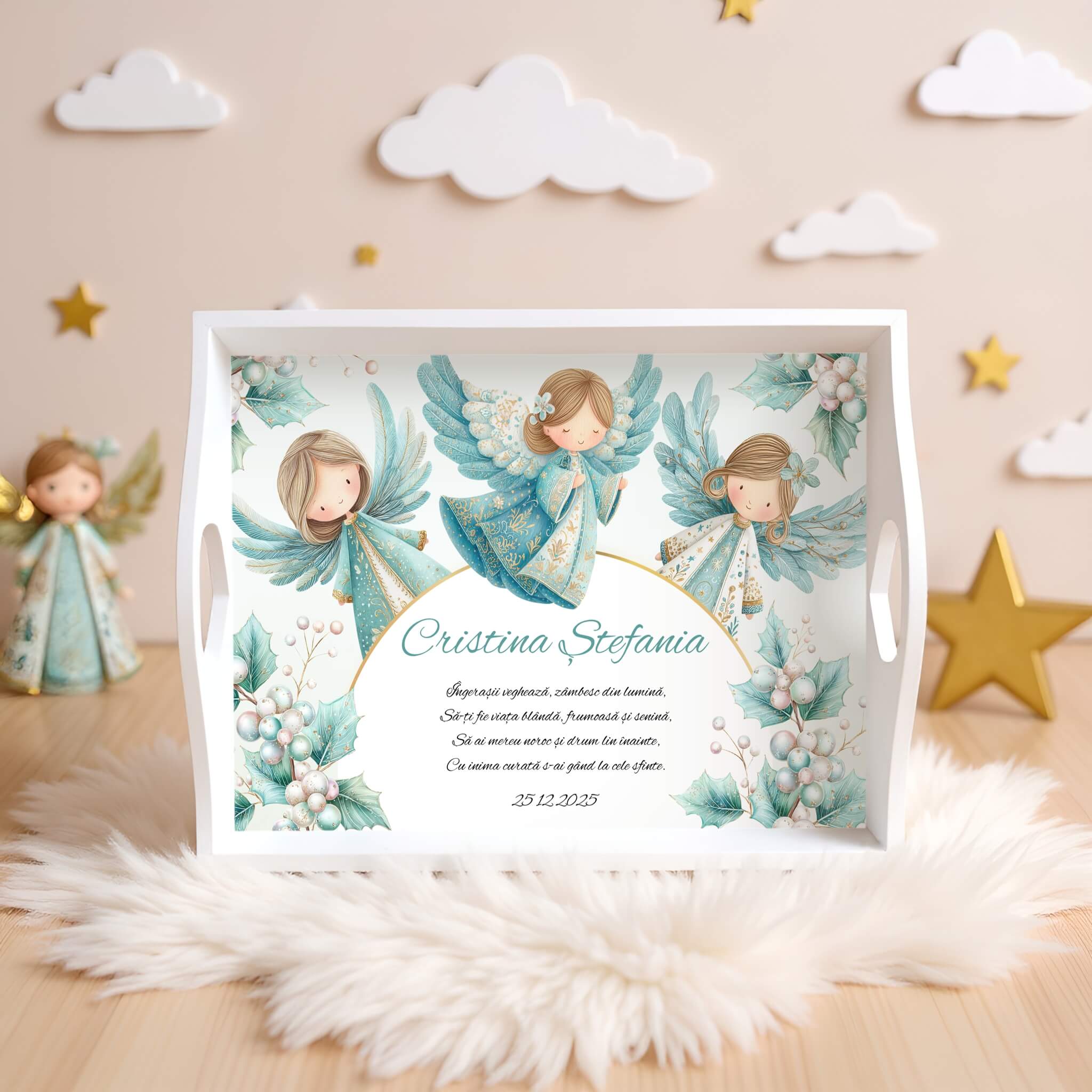 Set Tăviță Moț cu Îngerași, decorată într-un stil acuarelă delicat, cu tonuri turcoaz-aurii și elemente florale perlate, creat special pentru fetițe. Designul angelic și luminos transformă tradiția tăierii moțului într-un moment fermecător, ideal pentru fotografii și amintiri prețioase. Un set personalizat, elegant și festiv, inspirat din magia iernii.