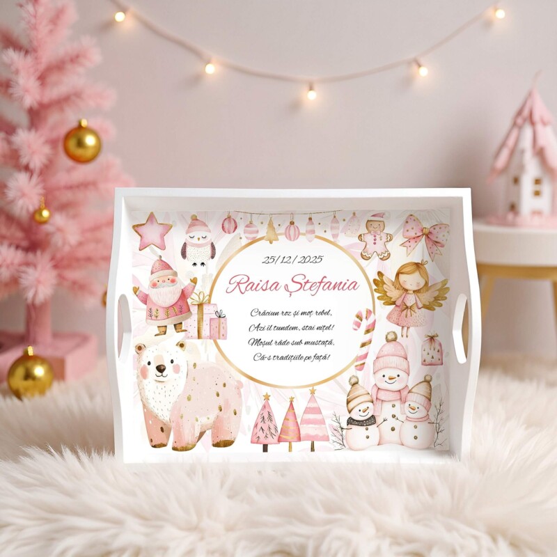 Tăviță Moț Crăciun Roz pentru fetițe, un set feeric, festiv, în stil pastel, cu îngerași, ursuleți și omuleți de zăpadă, cu o atmosferă dulce, luminoasă și copilărească perfectă pentru prima ei sărbătoare specială. Ideal pentru ceremonia tăierii moțului în atmosfera magică a Crăciunului.