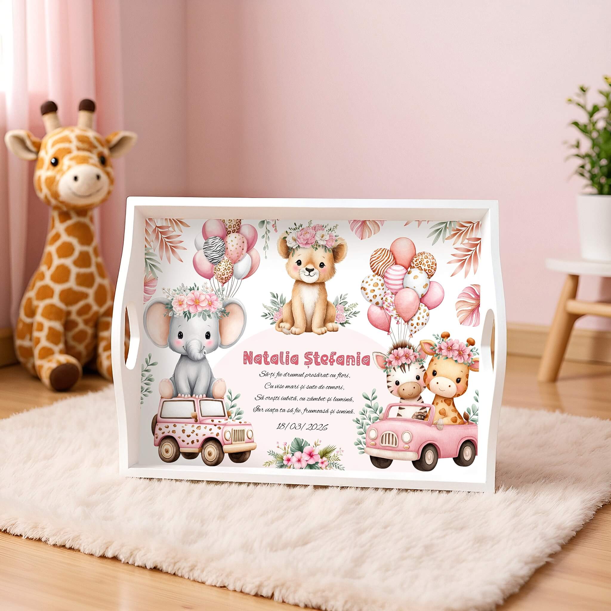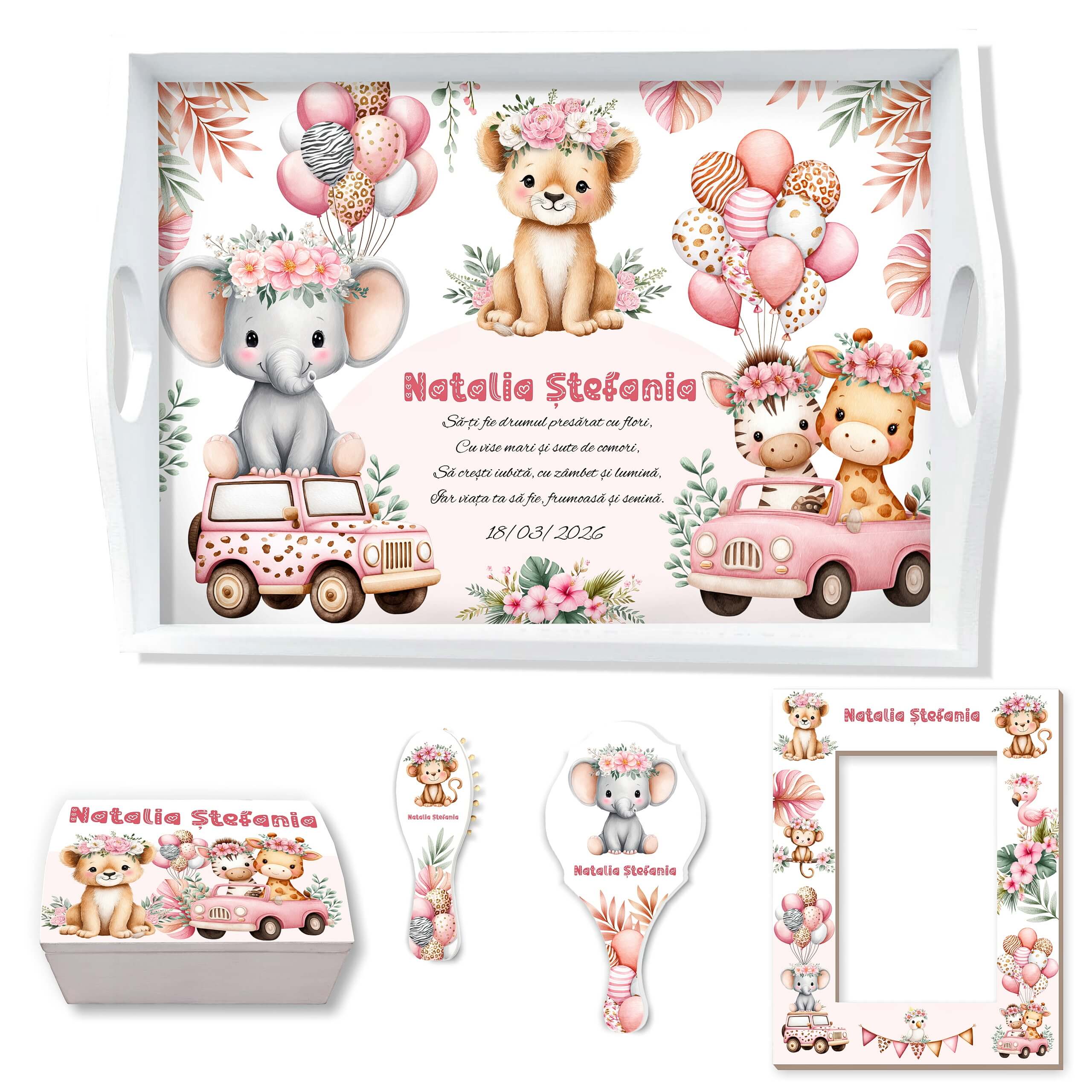 Transformă ceremonia de tăiere a moțului într-o poveste roz plină de magie cu Setul Pink Safari – Personalizat pentru Fetițe 🐘🦁🌸🎈